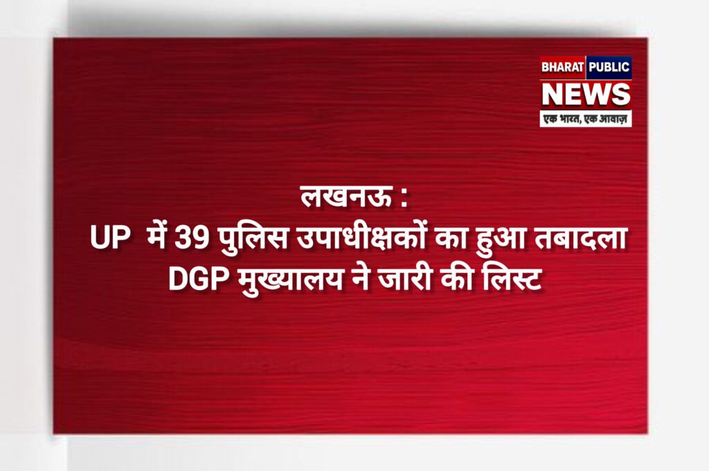 लखनऊ। पुलिस विभाग में अपर पुलिस अधीक्षकों के साथ ही 39 पुलिस उपाधीक्षकों के कार्यक्षेत्र भी बदले गए हैं। डीजीपी मुख्यालय ने पुलिस उपाधीक्षकों की तबादला सूची जारी की है।नाम वर्तमान तैनाती नवीन तैनातीगौरव कुमार शर्मा भ्रष्टाचार निवारण संगठन, जोन लखनऊ नागरिक उड्डयन एयरपोर्ट लखनऊहर्षित गंगवार महोबा तकनीकी सेवाएंसीमा यादव मंडलाधिकारी मुरादाबाद सहायक सेनानायक, 9वीं वाहिनी पीएसी मुरादाबादशिव ठाकुर बुलंदशहर मंडलाधिकारी मुरादाबाददीपक कुमार सिंह (द्वितीय) सीतापुर मंडलाधिकारी आगरानेहा त्रिपाठी कमिश्नरेट लखनऊ सीतापुरसत्य प्रकाश शर्मा मैनपुरी सहायक सेनानायक 8वीं वाहिनी पीएसी बरेलीऋषिकान्त शुक्ला उन्नाव मैनपुरीतेज बहादुर सिंह कमिश्नरेट कानपुर नगर उन्नावधर्मेन्द्र कुमार सिंह कमिश्नरेट लखनऊ सहायक सेनानायक 10वीं वाहिनी पीएसी बाराबंकीशैलजा मिश्रा मुरादाबाद पीटीसी मुरादाबादविजय प्रताप यादव (प्रथम) डीजीपी मुख्यालय सहायक सेनानायक 48वीं वाहिनी पीएसी सोनभद्रसुमित त्रिपाठी बाराबंकी सहायक सेनानायक 2वीं वाहिनी पीएसी सीतापुरप्रभात कुमार (द्वितीय) बलिया केंद्रीय वस्त्र भंडार, कानपुर नगररुद्र कुमार सिंह मुरादाबाद कमिश्नरेट प्रयागराजविजय प्रताप यादव (द्वितीय) साइबर क्राइम थाना बांदा कमिश्नरेट कानपुर नगरअनुज कुमार सिंह महाराजगंज गोरखपुरगवेन्द्र पाल गौतम लखीमपुर खीरी सहायक सेनानायक 45वीं वाहिनी पीएसी अलीगढ़अरविंद कुमार (द्वितीय) कमिश्नरेट गौतमबुद्धनगर लखीमपुर खीरीआभा सिंह महाराजगंज देवरियाशिव प्रताप सिंह (प्रथम) देवरिया महाराजगंजआनन्द कुमार (चतुर्थ) डीजीपी मुख्यालय सहायक सेनानायक 25वीं वाहिनी पीएसी रायबरेलीश्वेताभ भास्कर अमरोहा अमेठीअखिलेश राजन डीजीपी मुख्यालय बांदाराकेश कुमार नायक सहायक सेनानायक 28वीं वाहिनी पीएसी इटावा सहायक सेनानायक एकवीं वाहिनी एसएसएफ लखनऊरामशब्द डीजीपी मुख्यालय फिंगर प्रिंट ब्यूरो, लखनऊअमित कुमार कमिश्नरेट कानपुर नगर पीटीएस मेरठप्रदीप कुमार यादव सहायक सेनानायक 5वीं वाहिनी एसएसएफ सहारनपुर कमिश्नरेट लखनऊराम सिंह यादव (द्वितीय) जालौन कमिश्नरेट वाराणसीअम्बुज सिंह यादव कमिश्नरेट गाजियाबाद जालौनउमेश कुमार पांडेय जालौन सहायक सेनानायक 3वीं वाहिनी एसएसएफ प्रयागराजजय शंकर मिश्र अलीगढ़ बलियाजगमोहन सिंह डीजीपी मुख्यालय पुलिस मुख्यालयशिल्पा कुमारी हरदोई गोरखपुरआशुतोष चंदौली मुख्यमंत्री सुरक्षासंगम कुमार एटीसी सीतापुर बाराबंकीदिनेश कुमार पाठक एलआइयू अयोध्या एटीसी सीतापुरशैलेन्द्र सिंह अयोध्या से औरैया के लिए स्थानांतरणाधीन एलआइयू अयोध्यापुरुषोत्तम शर्मा सहायक सेनानायक 15वीं वाहिनी पीएसी आगरा सहायक सेनान