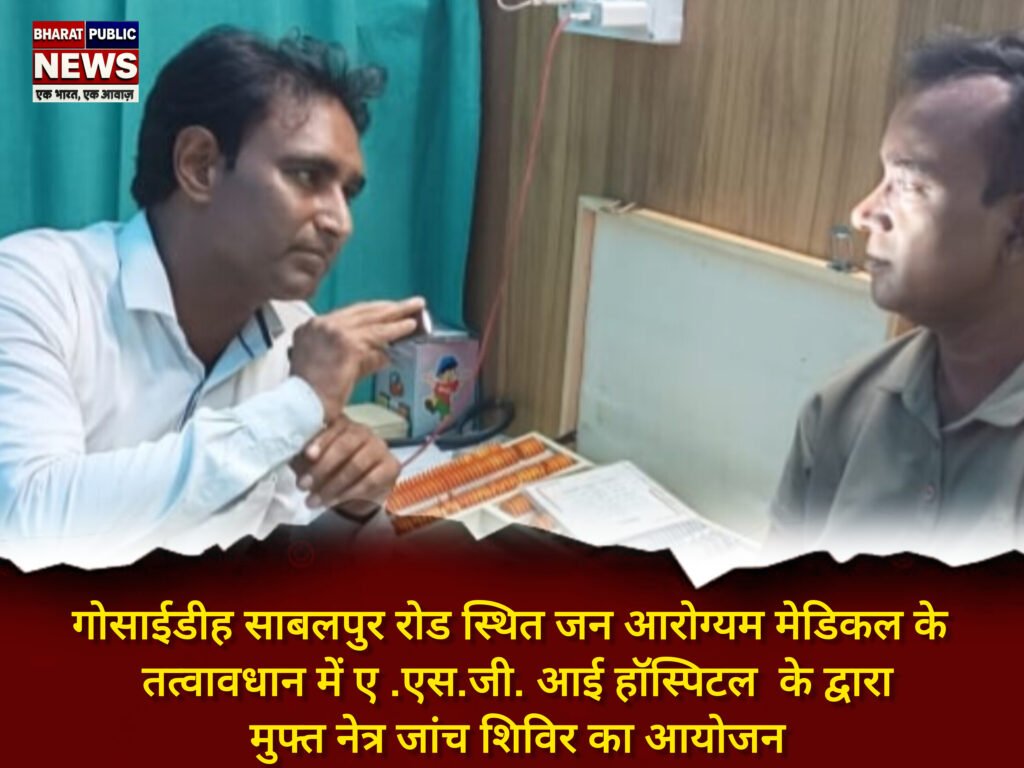 गोसाईडीह साबलपुर रोड स्थित जन आरोग्यम मेडिकल के तत्वावधान में ए .एस.जी. आई हॉस्पिटल अशोक नगर, धनसार के द्वारा मुफ्त नेत्र जांच शिविर का आयोजन किया गया। शिविर में लगभग 100 से अधिक मरीजों के आंखों की जांच की गई। कार्यक्रम को सफल बनाने में संचालक सह फार्मासिस्ट नीतीश कुमार साह एवं मनीष कुमार साह, सतीश कुमार साह, अविका, ईशान, संजीव झा, शशी झा, भोला, गणेश आदि लोगों का सराहनीय सहयोग रहा।