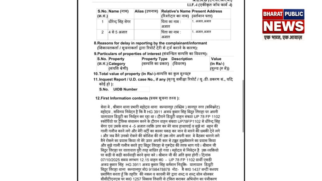 कानपुर कल्याणपुर में ड्यूटी पर तैनात यातायात पुलिस से बीजेपी नेता बताने वाले युवक को उलझना पड़ा भारी*✍️दबंग बीजेपी नेता के यातायात पुलिस से अभ्रदता करने पर उच्च अधिकारियों ने खबर का संज्ञान लेते पीड़ित यातायात गार्ड की तहरीर पर गंभीर धाराओं में मुकदमा हुआ पंजीकृत..!!**✍️अब देखना यह है कि उक्त प्रकरण में शातिर बीजेपी नेता धीरेंद्र सेंगर पर कब होगी कड़ी कार्यवाही!!*