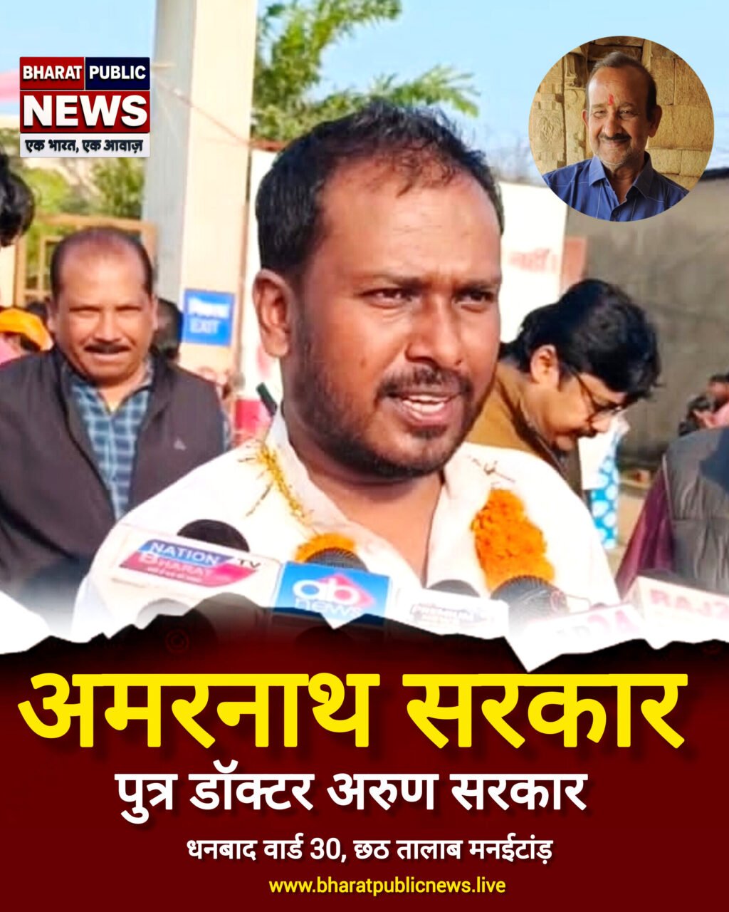 धनबाद वार्ड 30, छठ तालाब मनईटांड़ ,अमरनाथ सरकार ने नामांकन कर रैली के जरिए दिखाई ताकत, समर्थकों का उमड़ा सैलाबधनबाद : नगर निगम चुनाव के मद्देनजर धनबाद में राजनीतिक गतिविधियां तेज हो गई हैं। बुधवार को वार्ड नंबर 30 की पार्षद प्रत्याशी अमरनाथ सरकार ने भारी जनसमर्थन के साथ नामांकन पत्र दाखिल किया। उनके साथ ढोल-नगाड़ों और गाजे-बाजे की धुन पर निकली विशाल रैली ने उनकी चुनावी ताकत का जोरदार प्रदर्शन किया।