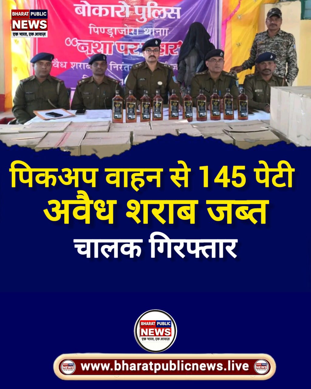#बोकारो पुलिस ने कार्रवाई करते हुए 145 पेटी शराब बरामद की है। पुलिस अधीक्षक, बोकारो को गुप्त सूचना मिली कि एक पिकअप चारपहिया वाहन में भारी मात्रा में अवैध शराब ले जाई जा रही है। सूचना के सत्यापन व कार्रवाई के लिए अनुमंडल पुलिस पदाधिकारी, चास के नेतृत्व में विशेष छापामारी दल का गठन किया गया।#छापामारी दल ने मिर्धा चेकनाका के पास सघन वाहन जांच शुरू की। इसी दौरान पिण्ड्राजोरा की ओर से तेज गति से आ रहे सफेद रंग के पिकअप (संख्या- झ05डीएफ-9463) को रोकने का इशारा किया गया। पुलिस को देखकर चालक वाहन सड़क पर खड़ा कर फरार होने लगा, जिसे पीछा कर दबोच लिया गया।#वाहन की तलाशी लेने पर 145 पेटी अवैध शराब बरामद की गई। प्रत्येक पेटी में 750 एमएल की 12 बोतलें थीं, जिन पर ‘प्रीमियम व्हिस्की फॉर सेल इन हरियाणा ओनली’ का स्टीकर लगा पाया गया। पकड़े गए अभियुक्त की पहचान रितेश प्रधान (30 वर्ष), जिला पूर्वी सिंहभूम निवासी के रूप में हुई है।#पुलिस ने आरोपी के विरुद्ध संबंधित धाराओं में मामला दर्ज कर आगे की कार्रवाई शुरू कर दी है। छापामारी दल में चास अनुमंडल पुलिस पदाधिकारी सहित पिण्ड्राजोरा थाना के कई पुलिस पदाधिकारी व कर्मी शामिल थे।