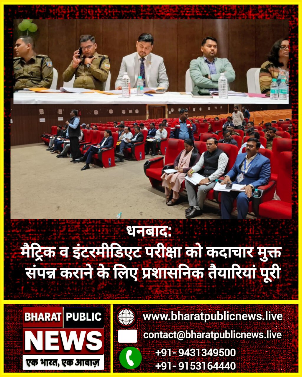 *वीडियो कॉल से की जाएगी स्कूलों की मॉनिटरिंग**सभी परीक्षा केंद्रों पर सुरक्षा की पर्याप्त व्यवस्था*उपायुक्त सह जिला दंडाधिकारी श्री आदित्य रंजन की अध्यक्षता में आज न्यू टाउन हॉल में 3 फरवरी से शुरू होने वाली मैट्रिक एवं इंटरमीडिएट परीक्षा को कदाचार मुक्त एवं शांतिपूर्ण तरीके से संपन्न कराने के लिए सभी प्रतिनियुक्त दंडाधिकारी, गश्ती दल दंडाधिकारी, स्टेटिक दंडाधिकारी तथा संबंधित पुलिस पदाधिकारियों को शांतिपूर्ण एवं कदाचार मुक्त परीक्षा संपन्न कराने के लिए आवश्यक दिशा निर्देश दिए गए।इस अवसर पर उपायुक्त ने कहा कि कदाचार मुक्त परीक्षा संपन्न कराने के लिए सभी प्रशासनिक तैयारियां पूरी कर ली गई है। परीक्षा के दौरान सरकार के परीक्षा संचालन अधिनियम 2001 का अनुपालन सुनिश्चित किया जाएगा। छात्रों को एक अच्छा माहौल देने के लिए हर केंद्र के शौचालय की साफ सफाई, पर्याप्त रोशनी की व्यवस्था, क्लास रूम में पंखे, पेयजल इत्यादि को लेकर आवश्यक दिशा निर्देश दिए गए हैं। उपायुक्त ने कहा कि परीक्षा को लेकर कंट्रोल रूम भी कार्यरत रहेगा। कंट्रोल रूम से वीडियो कॉल द्वारा सभी स्कूलों की निगरानी की जाएगी। अनुमंडल दंडाधिकारी श्री लोकेश बारंगे वरीय प्रभार में रहेंगे। कार्यपालक दंडाधिकारी श्री रवींद्रनाथ ठाकुर कंट्रोल रूम के प्रभार में जबकि जिला शिक्षा पदाधिकारी श्री अभिषेक झा नोडल पदाधिकारी रहेंगे। परीक्षा के लिए स्टेटिक दंडाधिकारी, गश्ती दल प्रभारी दंडाधिकारी की प्रतिनियुक्ति की गई है। साथ ही प्रश्न पत्र एवं उत्तर पुस्तिका लाने ले जाने के लिए वाहन, सुचारू यातायात व्यवस्था, सेंटर पर सीसीटीवी कैमरे इत्यादि को लेकर आवश्यक दिशा निर्देश दिए हैं। इस अवसर पर वरीय पुलिस अधीक्षक श्री प्रभात कुमार ने कहा कि सभी सेंटरों पर सुरक्षा की पर्याप्त व्यवस्था रहेगी। प्रवेश से पहले छात्रों की अच्छे से चेकिंग की जाएगी। दंडाधिकारियों के साथ पुलिस पदाधिकारी रहेंगे। सभी को समय पर प्रश्न पत्र लेकर स्कूल पहुंचने एवं परीक्षा के बाद उत्तर पुस्तिका लेकर समय पर स्ट्रांग रूम पहुंचने के लिए निर्देशित किया है। सुगम यातायात के लिए अतिरिक्त पुलिस बल की प्रतिनियुक्ति की है।अनुमंडल दंडाधिकारी श्री लोकेश बारंगे ने कहा कि परीक्षा के दौरान सभी परीक्षा केंद्रों के 100 मीटर परिक्षेत्र में 2 फरवरी 2026 की रात्रि 12:00 बजे से परीक्षा की प्रत्येक तिथि से परीक्षा समाप्ति तक के लिए भारतीय नागरिक सुरक्षा संहिता (बी.एन.एस.एस.) की धारा 163 के तहत निषेधाज्ञा लागू रहेगी।उल्लेखनीय है कि वार्षिक माध्यमिक परीक्षा (मैट्रिक) 03 फरवरी 2026 से 17 फरवरी 2026 तक 96 परीक्षा केन्द्रों पर सुबह 09:45 बजे से दोपहर 01:00 बजे तक आयोजित की जाएगी तथा इंटरमीडिएट परीक