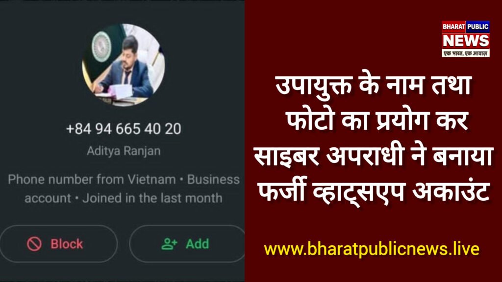 *उपायुक्त ने आमजनों को सतर्क रहने का किया अपील*उपायुक्त सह जिला दंडाधिकारी श्री आदित्य रंजन के नाम एवं प्रोफाइल फोटो का दुरुपयोग करते हुए किसी साइबर अपराधी ने फर्जी व्हाट्सएप अकाउंट(+84 946654020) (+84 915748591) बनाया है। इसके जरिये साइबर अपराधी प्रशासनिक पदाधिकारियों सहित अन्य लोगों को मैसेज कर ठगी करने का प्रयास कर रहा है। ठग के विरुद्ध कार्रवाई के लिए मामले की सूचना पुलिस को दी गयी है।*उपायुक्त ने आमजनों को सतर्क रहने का किया अपील*उपायुक्त ने आमलोगों को सतर्क रहने और ऐसे ठग के किसी भी झांसे में नहीं आने की अपील की है। उन्होंने कहा है कि यदि किसी अनाधिकृत फोन नंबर या सोशल मीडिया अकाउंट से पैसों की मांग की जाती है या किसी प्रकार का प्रलोभन, लिंक भेजा जाता है, तो उसे तुरंत ब्लॉक कर संबंधित सोशल मीडिया में रिपोर्ट करें। साथ ही किसी भी संदिग्ध मैसेज या लिंक को क्लिक करने से बचें।