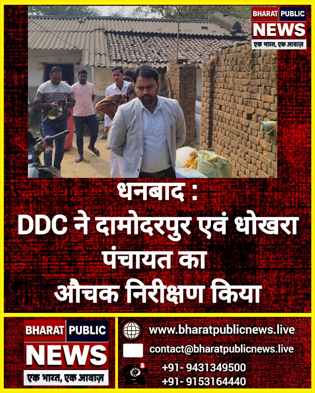 धनबाद। उप विकास आयुक्त सन्नी राज ने आज धनबाद प्रखंड अंतर्गत दामोदरपुर एवं धोखरा पंचायत का औचक निरीक्षण किया। इस क्रम में उन्होंने आवास प्लस 2024 के अंतर्गत सर्वेक्षित परिवार के घरों का सत्यापन व जांच की। इस दौरान उन्होंने देखा कि एक महिला का घर अत्यंत जर्जर अवस्था में है। उन्होंने महिला से बातचीत की। बातचीत के क्रम में पता चला कि महिला के पति ने उसे छोड़ दिया है और वह अकेले ही लंबे समय से उक्त जर्जर घर में अकेली रहती है। इस पर त्वरित संज्ञान लेकर उप विकास आयुक्त ने ऑन द स्पॉट महिला को बाबा साहेब भीमराव अम्बेडकर योजना के तहत आवास देने की अनुशंसा की। इसके बाद उन्होंने दामोदरपुर के आयुष्मान आरोग्य मन्दिर एवं पंचायत भवन का भ्रमण किया।मौके पर जिला समन्वयक सुशांत कुमार, संबंधित प्रखंड के प्रखंड समन्वयक एवं संबंधित पंचायत के दामोदरपुर पंचायत के सचिव चंदा कुमारी, पंचायत सेवक, सत्यापनकर्ता तथा मुखिया, दामोदरपुर पंचायत के उप मुखिया राजेश शर्मा उपस्थित थे।
