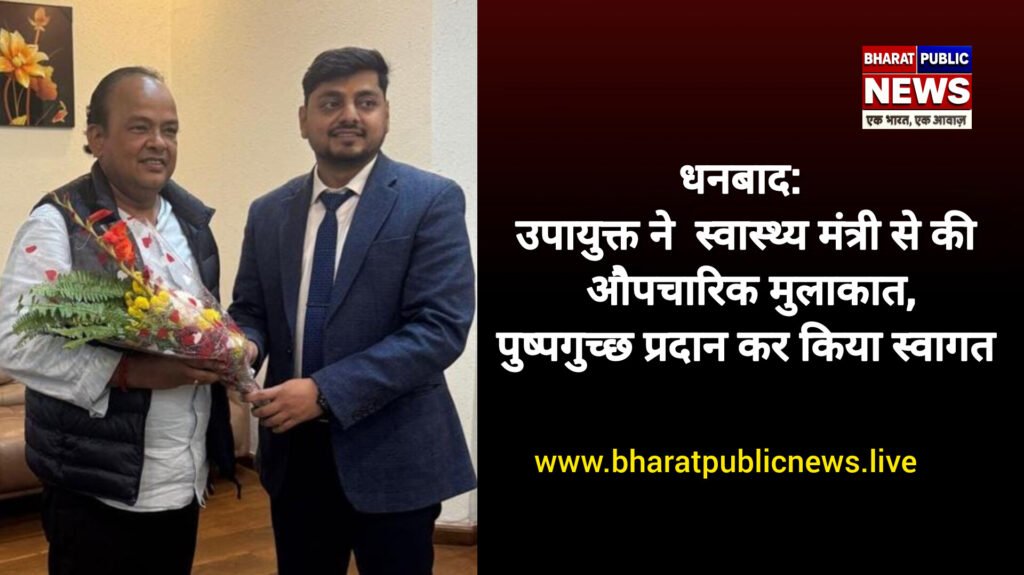 झारखंड के माननीय स्वास्थ्य मंत्री डॉ इरफान अंसारी धनबाद जिला पहुंचे। माननीय स्वास्थ्य मंत्री के धनबाद आगमन पर उपायुक्त सह जिला दंडाधिकारी श्री आदित्य रंजन ने परिसदन भवन में औपचारिक मुलाकात की और पुष्पगुच्छ प्रदान कर स्वागत किया।इस दौरान माननीय स्वास्थ्य मंत्री जी ने धनबाद जिला के स्वास्थ्य व्यवस्थाओं तथा सुविधाओं को लेकर उपायुक्त से चर्चा की। उपायुक्त श्री आदित्य रंजन ने धनबाद जिला में स्वास्थ्य विभाग में हो रहे विकास कार्यों से माननीय मंत्री को अवगत कराया। माननीय मंत्री ने स्वास्थ्य सुविधाओं तथा व्यवस्थाओं को और बेहतर करने हेतु आवश्यक दिशा निर्देश दिए।