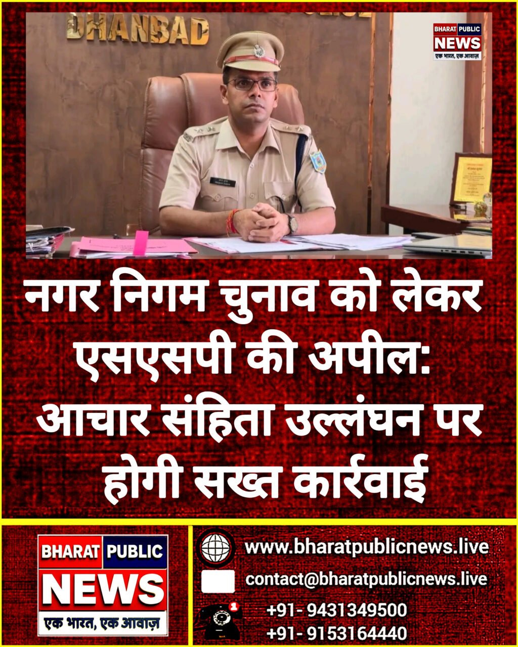 धनबाद नगर निगम चुनाव की घोषणा के साथ ही जिला पुलिस प्रशासन पूरी तरह सतर्क हो गया है। वरीय पुलिस अधीक्षक (एसएसपी) प्रभात कुमार ने सभी संभावित उम्मीदवारों से आदर्श आचार संहिता का शत-प्रतिशत पालन करने की अपील की है। उन्होंने कहा कि बिना अनुमति जुलूस या सभा, भड़काऊ भाषण, पोस्टर–बैनर और किसी भी तरह की अवैध गतिविधि पर कड़ी कार्रवाई की जाएगी।एसएसपी ने बताया कि स्वतंत्र, निष्पक्ष और शांतिपूर्ण चुनाव कराने के लिए संवेदनशील क्षेत्रों में विशेष निगरानी रखी जाएगी। साथ ही सोशल मीडिया पर अफवाह और भ्रामक पोस्ट फैलाने वालों पर भी पुलिस की कड़ी नजर रहेगी।उन्होंने मतदाताओं से अपील की कि वे किसी भी प्रकार के प्रलोभन या दबाव में न आएं और मतदान के दौरान संदिग्ध गतिविधि दिखने पर तुरंत पुलिस को सूचना दें। एसएसपी ने भरोसा दिलाया कि चुनाव के दौरान पर्याप्त पुलिस बल की तैनाती की जाएगी और गड़बड़ी फैलाने वालों पर सख्त वैधानिक कार्रवाई होगी।
