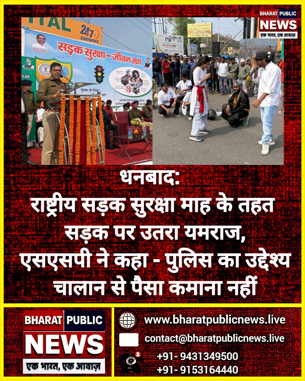 तेज रफ्तार, लापरवाह ड्राइविंग और नियमों की अनदेखी के बीच लगातार बढ़ रही सड़क दुर्घटनाओं ने प्रशासन की चिंता बढ़ा दी है। इसे लेकर धनबाद पुलिस ने शुक्रवार को एक अनोखी, लेकिन बेहद प्रभावी पहल करते हुए सड़क पर उतरकर आम लोगों को ट्रैफिक नियमों का ककहरा सिखाया। जिला परिवहन विभाग द्वारा आयोजित राष्ट्रीय सड़क सुरक्षा माह के तहत मेमको मोड़ पर पुलिस का एक अलग ही रूप देखने को मिला। यहां पुलिस सिर्फ चालान काटने नहीं, बल्कि लोगों की जान बचाने के संकल्प के साथ मैदान में उतरी।सड़क दुर्घटनाओं के आंकड़े बेहद भयावह तस्वीर पेश कर रहे हैं। वर्ष 2025 में जिले में लगभग 350 सड़क दुर्घटनाएं दर्ज की गईं। जिनमें करीब 250 लोगों की मौत हो चुकी है। ये आंकड़े साफ संकेत दे रहे हैं कि ट्रैफिक नियमों की अनदेखी अब केवल गलती नहीं, बल्कि मौत का न्योता बन चुकी है। इन्हीं हालातों को देखते हुए एसएसपी प्रभात कुमार के नेतृत्व में पूरा पुलिस महकमा आज सड़क पर उतरा।कार्यक्रम का सबसे आकर्षक और प्रभावशाली पहलू रहा नुक्कड़ नाटक। टीम शक्ति के कलाकारों ने सड़क के बीच मंच सजाया और नाटक के जरिए लोगों को झकझोर कर रख दिया। नाटक में दिखाया गया कि कैसे बिना हेलमेट, बिना सीट बेल्ट, मोबाइल पर बात करते हुए या तेज रफ्तार में वाहन चलाना इंसान को सीधे ‘यमराज’ के दरबार तक पहुंचा सकता है। राह चलते लोग रुककर नाटक देखते रहे और कई लोगों ने मौके पर ही नियमों का पालन करने का संकल्प लिया।मीडिया से बात करते हुए एसएसपी प्रभात कुमार ने कहा कि पुलिस का उद्देश्य चालान से पैसा कमाना नहीं है। पुलिस का लक्ष्य चालान की संख्या को शून्य (Zero) तक लाना है। पुलिस चाहती हैं कि लोग डर से नहीं, समझ से नियमों का पालन करें। उन्होंने कहा कि हेलमेट, सीट बेल्ट और ट्रैफिक नियम कोई बोझ नहीं, बल्कि जीवन रक्षक कवच हैं।धनबाद पुलिस अब नियमों को लेकर और सख्त होने जा रही है। 1 फरवरी से विशेष चेकिंग अभियान शुरू किया जाएगा। जिसमें बाइक के पीछे बैठने वाली सवारी के लिए भी हेलमेट अनिवार्य, गलत या अवैध नंबर प्लेट पर तत्काल कार्रवाई और चार पहिया वाहनों में ब्लैक फिल्म और सीट बेल्ट की अनदेखी पर भारी जुर्माना,जैसे नियमों को सख्ती से लागू किया जाएगा।बीते वर्ष पुलिस द्वारा 5 करोड़ रुपये से अधिक का जुर्माना वसूला गया, जो यह दर्शाता है कि ट्रैफिक नियमों के प्रति लापरवाही अब भी गंभीर स्तर पर है। लेकिन पुलिस का स्पष्ट कहना है कि उसका लक्ष्य अब राजस्व नहीं, बल्कि ‘जीरो एक्सीडेंट’ है। इस जागरूकता कार्यक्रम में सिटी एसपी, ग्रामीण एसपी, ट्रैफिक डीएसपी, साइबर डीएसपी समेत कई वरीय अधिकारी मौके पर मौजूद रहे। अधिकारियों ने गलत दिशा में चलने वाले और नियम तोड़ने वाले वाहन चालकों को कड़ी चेतावनी देते हु