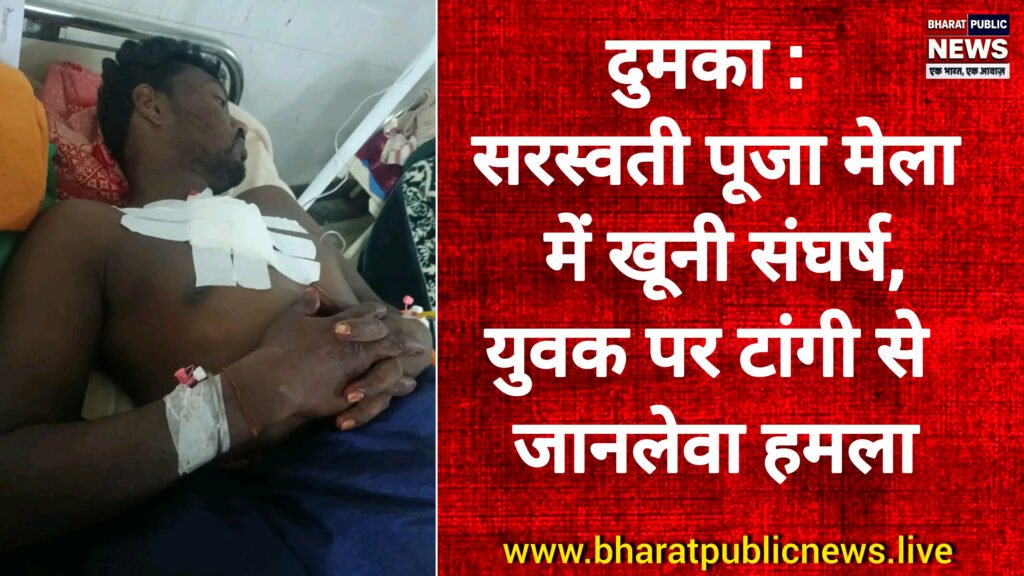 रामगढ़ थाना क्षेत्र के कांजो पंचायत अंतर्गत सिमरा हटिया में सरस्वती मेला के सांस्कृतिक कार्यक्रम के दौरान पुराना विवाद हिंसक झड़प में बदल गया।मंगलवार रात करीब 10:30 बजे पहले गाली-गलौज हुई, फिर आधा दर्जन लोगों ने एक युवक पर टांगी से जानलेवा हमला कर दिया। घटना के बाद इलाके में अफरा-तफरी मच गई।🔴 सीने और पीठ पर ताबड़तोड़ वार, हालत नाजुकहमले में घायल युवक की पहचान शिवा मंत्री के रूप में हुई है। आरोप है कि सुशील दास, पलटू दास समेत अन्य ने मिलकर लोहे की टांगी से उसके सीने और पीठ पर लगातार वार किए, जिससे वह लहूलुहान होकर गिर पड़ा।सूचना मिलते ही पुलिस मौके पर पहुंची और घायल को रामगढ़ सामुदायिक स्वास्थ्य केंद्र ले जाया गया। गंभीर स्थिति देखते हुए उसे फुलो-झानो मेडिकल कॉलेज अस्पताल, दुमका रेफर किया गया, जहां उसकी हालत नाजुक बनी हुई है।👮 एफआईआर दर्ज, आरोपियों की तलाश में छापेमारीथाना प्रभारी मनीष कुमार ने बताया कि मामले में प्राथमिकी दर्ज कर ली गई है और आरोपियों की गिरफ्तारी के लिए लगातार छापेमारी की जा रही है। प्रारंभिक जांच में पुराने विवाद की भूमिका सामने आ रही है, पूरे मामले की गहन जांच जारी है।⚠️ शांति व्यवस्था बनाए रखें — पुलिस ने लोगों से अफवाहों से बचने और सहयोग करने की अपील की है।