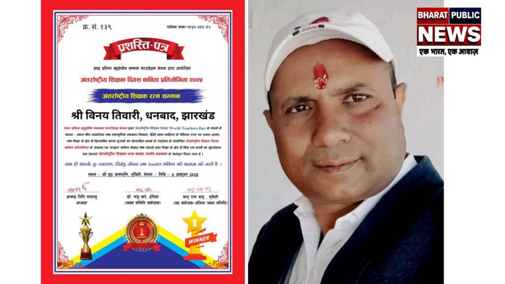 नेपाल की प्रसिद्ध संस्था शब्द प्रतिभा बहुक्षेत्रीय सम्मान फाउन्डेशन का आयोजननेपाल-राँची – झारखंड सरकार से सम्मानित खोरठा के मशहूर साहित्यकार-गीतकार विनय तिवारी को “ शब्द प्रतिभा बहुक्षेत्रीय सम्मान फाउंडेशन नेपाल “ द्वारा अन्तर्राष्ट्रीय शिक्षक दिवस के संदर्भ में नेपाल भारत के बीच सामाजिक तथा सांस्कृतिक संबंध विकास,हिंदी भाषा साहित्य के वैश्विक स्तर पर प्रचार प्रसार तथा शिक्षा के क्षेत्र में क्रियाशील काव्य सर्जकों को प्रोत्साहित करने के उद्देश्य से आयोजित अंतर्राष्ट्रीय शिक्षक दिवस कविता प्रतियोगिता के अवसर पर उत्कृष्ट कविता लेखन तथा शिक्षा के क्षेत्र में किए गए कार्यों का मूल्याँकन कर “अंतरराष्ट्रीय शिक्षक रत्न मानद उपाधि सम्मान “ से अलंकृत किया गया ।भारत के पड़ोसी देश नेपाल के लुंबिनी में आयोजित कार्यक्रम में धनबाद जिले के कतरास के रोआम गांव के रहने वाले खोरठा साहित्यकार -गीतकार बहुमुखी प्रतिभा के धनी विनय तिवारी की रचनाएं देश-विदेश की पत्र-पत्रिकाओं में प्रकाशित होती हैं. उन्हें झारखंड सरकार सहित दर्जनों सम्मान मिल चुका है.नेपाली-हिंदी को मैत्री भाषा बनाने में सहयोग के लिए हुआ आयोजन नेपाल में आयोजित इस अंतरराष्ट्रीय आयोजन का उद्देश्य देश-विदेश की प्रतिभा को प्रोत्साहित करने के साथ-साथ देवनागरी लिपि के सरंक्षण-संवर्द्धन, नेपाल-भारत के संबंधों को सुदृढ़ बनाने और नेपाली एवं हिंदी भाषा को दोनों देशों की मैत्री भाषा बनाने में सहयोग करना है.संस्था के अध्यक्ष आनन्द गिरि मायालु ने कहा कि खोरठा साहित्यकार-गीतकार विनय तिवारी बहुआयामिक व्यक्तित्व के धनी लेखक, कवि,लोकगायक साहित्यकार, निर्देशक,फ़िल्मलेखक व लोक कलाकार हैं. इनके लेखन में एक सहजता सरलता पाई गई है. इनकी कविताओं में समाज को रूपांतरण करने की क्षमता है. इनकी साहित्यिक यात्रा इसी तरह नित नए शिखर को स्पर्श करे.अंतरराष्ट्रीय शिक्षक दिवस कविता प्रतियोगिता में विजयी होने पर झारखंड के साहित्यकारों व शिक्षाविदों में खुशी की लहर है. विनय तिवारी की इस उपलब्धि पर दिनेश दिनमणि,आवाज 7 डेज़ के संपादक उत्तम मुख़र्जी, खोरठा अभिनेता अमन राठौर,संदीप कुमार महतो,बीरबल महतो,खागेन्द्र महतो,अनुज महतो, के अलावा अन्य गणमान्य मान्य लोगों ने बधाईयां दी है.