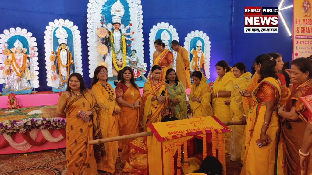 धनबाद। बंगाली बहुल क्षेत्र हीरापुर में दुर्गा पूजा की शुरुआत पारंपरिक बांग्ला रीति-रिवाजों के साथ की गई। महासप्तमी के अवसर पर आज विभिन्न पूजा समितियों ने स्थानीय तालाबों से कोलाबऊ (नवपत्रिका) को स्नान कराकर पूरे विधि-विधान के साथ पूजा-अर्चना की। इसके बाद ढाक की गूंज और भक्तों के नृत्य-गान के बीच पालकी द्वारा शोभायात्रा निकालकर पूजा मंडपों में कोलाबऊ की स्थापना की गई। इसी के साथ महासप्तमी पूजा का शुभारंभ हुआ।नेपाली काली मंदिर, हीरापुर दुर्गा मंदिर, जगदंबा मंदिर, खोखन तालाब स्थित मंदिर, बंगाली कल्याण समिति, देवी पाड़ा, झरना पाड़ा समेत सभी पूजा समितियों के सदस्य खोखन तालाब से नवपत्रिका और घट का जल लेकर अपने-अपने पूजा पंडालों तक शोभायात्रा के रूप में पहुंचे। वहीं हीरापुर हरि मंदिर, जगाधत्री मंदिर, वाच एंड वार्ड कॉलोनी तथा हीरापुर पार्क मार्केट स्थित बंगाली वेलफेयर सोसाइटी ने पंपु तालाब से नवपत्रिका और घट का जल लाकर पूजा मंडपों में स्थापित किया।इस दौरान भक्तगण पारंपरिक वाद्य ढाक की धुन पर झूमते, नाचते और गाते हुए नजर आए। चारों ओर भक्ति और उल्लास का वातावरण देखने को मिला।जानकारी के अनुसार सप्तमी के दिन प्रातः नवपत्रिका यानी कोलाबऊ, जिसमें देवी दुर्गा के नौ रूपों का प्रतीक नौ पौधे शामिल होते हैं, को जलाशय में स्नान कराकर पूरे विधि-विधान से पूजा की जाती है। इसके बाद नवपत्रिका को दुर्गा पूजा मंडप में लाकर स्थापित किया जाता है, जिससे पूजा की औपचारिक शुरुआत होती है।