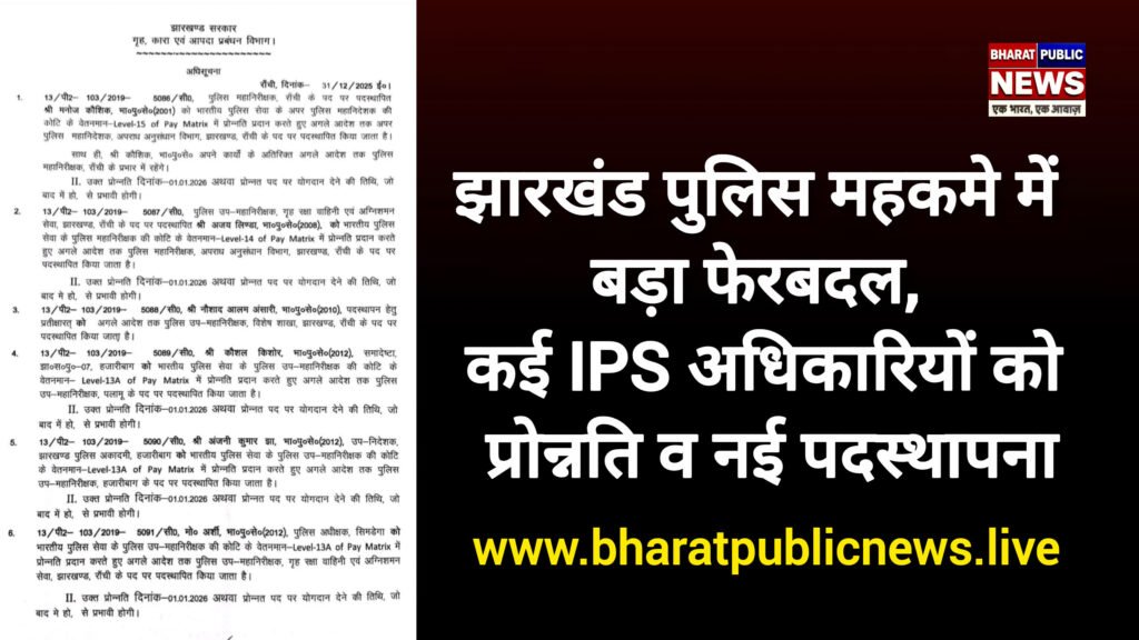 झारखंड पुलिस महकमे में बड़ा फेरबदल, कई IPS अधिकारियों को प्रोन्नति व नई पदस्थापनाझारखंड सरकार के गृह, कारा एवं आपदा प्रबंधन विभाग ने भारतीय पुलिस सेवा (IPS) के अधिकारियों के प्रोन्नति एवं स्थानांतरण को लेकर व्यापक स्तर पर प्रशासनिक फेरबदल किया है। इस संबंध में विभाग की ओर से मंगलवार को अधिसूचना जारी की गई।अधिसूचना के अनुसार, आईजी मनोज कौशिक (2001 बैच) को अपर पुलिस महानिदेशक (ADG) के पद पर प्रोन्नति देते हुए अपर पुलिस महानिदेशक, अपराध अनुसंधान विभाग (CID), झारखंड के पद पर पदस्थापित किया गया है। साथ ही वे अगले आदेश तक पुलिस महानिरीक्षक, रांची का अतिरिक्त प्रभार भी संभालेंगे।वहीं, अजय लिंडा (2008 बैच) को पुलिस महानिरीक्षक (IG) के पद पर प्रोन्नत कर CID झारखंड में पदस्थापित किया गया है।इसके अलावा नौशाद आलम अंसारी (2010 बैच) को पुलिस उप-महानिरीक्षक, विशेष शाखा, झारखंड बनाया गया है।कौशल किशोर (2012 बैच) को DIG पद पर प्रोन्नत कर पलामू में पदस्थापित किया गया है, जबकिअंजनी कुमार झा (2012 बैच) को DIG बनाकर हजारीबाग का प्रभार सौंपा गया है।इसी क्रम में मो. अर्शी (2012 बैच) को DIG पद पर प्रोन्नत कर गृह रक्षा वाहिनी एवं अग्निशमन सेवा, झारखंड में पदस्थापित किया गया है।आनंद प्रकाश (2012 बैच) को शर्तों के साथ DIG पद पर प्रोन्नति देते हुए बोकारो में पदस्थापित किया गया है।स्थानांतरण आदेश के तहत श्रीकांत सुरेश राव खोत्रे (2015 बैच) को पुलिस अधीक्षक, सिमडेगा,कैलाश करमाली (2017 बैच) को समादेष्टा, गृह रक्षा वाहिनी, रांची,शिवम प्रकाश (2022 बैच) को राज्यपाल के परिसहाय (पुलिस) के पद पर पदस्थापित किया गया है।वहीं प्रशिक्षणोपरांत पदस्थापन हेतु प्रतीक्षारत निखिल राय (2023 बैच) एवं श्रुति (2023 बैच) को सहायक पुलिस अधीक्षक, भ्रष्टाचार निरोधक ब्यूरो, झारखंड में नियुक्त किया गया है।केंद्र सरकार द्वारा नवनियुक्त IPS अधिकारियों को भी राज्य में नई जिम्मेदारियां सौंपी गई हैं। इनमें अविनाश कुमार, दीपक कुमार, मजरुल होदा, राजेश कुमार, रोशन गुड़िया एवं श्रीराम शमद शामिल हैं, जिन्हें झारखंड सशस्त्र पुलिस, CID, ACB एवं अन्य इकाइयों में पदस्थापित किया गया है।सरकार ने स्पष्ट किया है कि सभी प्रोन्नतियां 1 जनवरी 2026 या पदभार ग्रहण करने की तिथि, जो बाद में हो, से प्रभावी होंगी। जिन अधिकारियों का स्थानांतरण तो हुआ है लेकिन नई पदस्थापना नहीं दी गई है, उन्हें पुलिस मुख्यालय, झारखंड, रांची में योगदान देने का निर्देश दिया गया है।यह आदेश राज्यपाल के आदेश से गृह, कारा एवं आपदा प्रबंधन विभाग द्वारा जारी किया गया है।