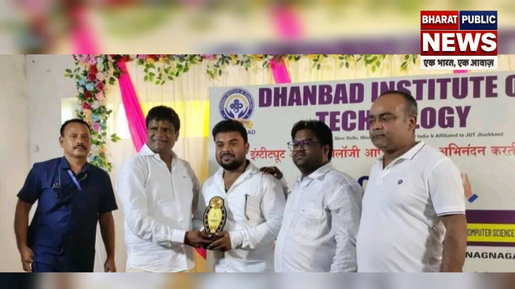 धनबाद:शक्तिनगर भेलाटांड स्थितधनबाद इंस्टिट्यूट ऑफ टेक्नोलॉजी में 2025-28 बैच के नए पाठ्यक्रम का शुभारंभ बड़े ही उत्साहपूर्वक किया गया। इस अवसर पर आयोजित भव्य कार्यक्रम में लगभग 500 नए विद्यार्थियों ने भाग लिया। कार्यक्रम में जिले के कई समाजसेवी एवं बुद्धिजीवी भी उपस्थित रहे, जिनका सम्मान संस्थान की ओर से अंगवस्त्र एवं मोमेंटो प्रदान कर किया गया।कार्यक्रम के मुख्य अतिथि धनबाद लोकसभा सांसद ढुल्लू महतो ने दीप प्रज्वलित कर शुभारंभ किया और विद्यार्थियों को संबोधित करते हुए कहा कि शिक्षा ही जीवन में आगे बढ़ने की सबसे बड़ी पूंजी है। उन्होंने विद्यार्थियों से अपने माता-पिता का नाम रोशन करने और समाज व देश के विकास में योगदान देने का आह्वान किया।इस अवसर पर सामाजिक संस्था समर्पण एक नेक पहल के संस्थापक सह केंद्रीय अध्यक्ष दिपेश चौहान को संस्थान की ओर से सांसद ढुलू महतो के द्वारा अंगवस्त्र और मोमेंटो देकर सम्मानित किया गया। श्री चौहान ने कहा कि शिक्षा ही राष्ट्र निर्माण की आधारशिला है और आज की युवा पीढ़ी को ज्ञान और नैतिकता के साथ आगे बढ़कर समाज में सकारात्मक परिवर्तन लाना चाहिए।पूरे कार्यक्रम में उत्साह और जोश का माहौल देखने को मिला। नए विद्यार्थियों ने भी अपने संकल्प को व्यक्त करते हुए शिक्षा के माध्यम से उज्जवल भविष्य बनाने का भरोसा दिलाया।मौके पर मुख्य रूप से इंस्टिट्यूट के चेयरमैन प्रेम प्रकाश, प्रिंसिपल राजेंद्र राज, शिक्षक राज गोस्वामी, समाजसेवी पिंकी गुप्ता, श्वेता किन्नर, रवि शेखर, धीरज सिंह, शिवम चौधरी, सोनू कुमार एवं अन्य मुख्य रूप से उपस्थित थे l