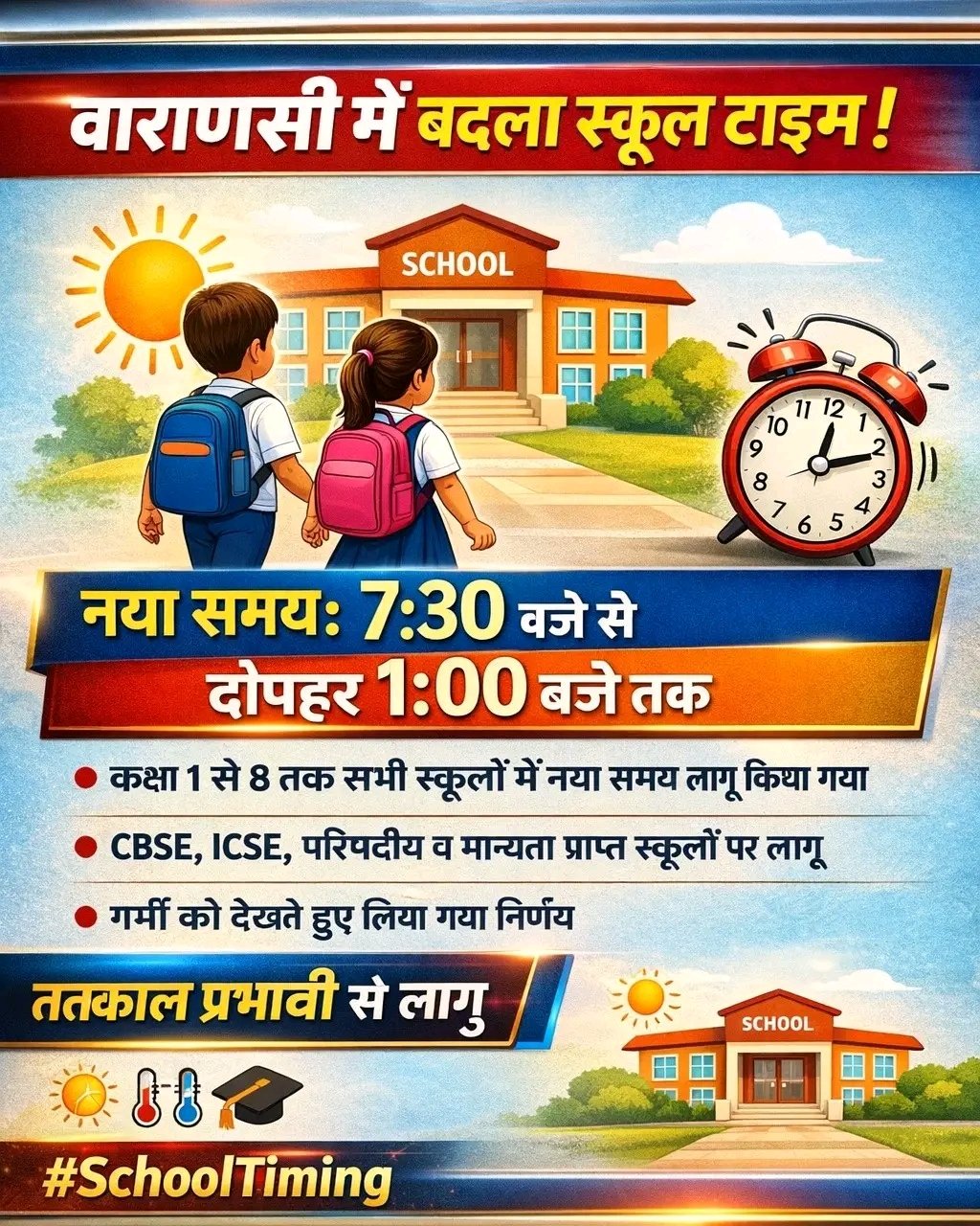 जिलाधिकारी के निर्देश पर वाराणसी जनपद में कक्षा 1 से 8 तक के सभी विद्यालयों के संचालन समय में बदलाव किया गया है।नए आदेश के अनुसार, परिषदीय, राजकीय, मान्यता प्राप्त, सहायता प्राप्त, CBSE और ICSE से संबद्ध सभी अंग्रेजी एवं हिन्दी माध्यम के विद्यालय अब सुबह 7:30 बजे से दोपहर 1:00 बजे तक संचालित किए जाएंगे।यह आदेश तत्काल प्रभाव से लागू कर दिया गया है और अगले निर्देश तक प्रभावी रहेगा।प्रशासन द्वारा यह निर्णय बढ़ती गर्मी को देखते हुए छात्रों के स्वास्थ्य और सुरक्षा को ध्यान में रखकर लिया गया है, ताकि बच्चों को भीषण गर्मी से राहत मिल सके।