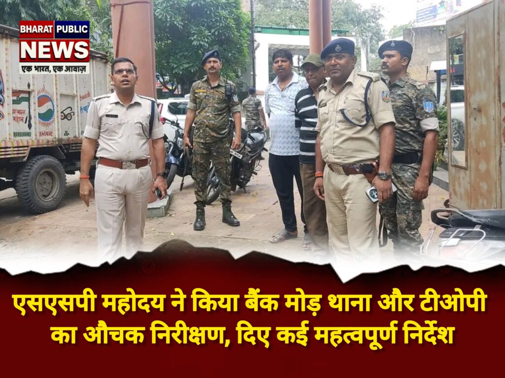 *पर्व त्योहार व दुर्गा पूजा के मद्देनज़र बाजार, मॉल व भीड़भाड़ वाले क्षेत्र में चौकसी बढ़ाने के निर्देश*धनबाद के वरीय पुलिस अधीक्षक (एसएसपी) श्री प्रभात कुमार ने आज शनिवार को बैंक मोड़ थाना का औचक निरीक्षण किया। इस दौरान उन्होंने थाना परिसर का जायजा लिया और वहां मौजूद पुलिस पदाधिकारियों एवं जवानों से कामकाज की जानकारी ली।निरीक्षण के दौरान एसएसपी महोदय ने थाना के अभिलेख, केस डायरी, FIR रजिस्टर, मालखाना, हाजत समेत साफ-सफाई और सुरक्षा व्यवस्था का बारीकी से निरीक्षण किया। उन्होंने थाना में लंबित मामलों की स्थिति की जानकारी लेते हुए उन्हें जल्द से जल्द निष्पादित करने के साथ साथ अपराधियों के सत्यापन का निर्देश भी दिया।एसएसपी महोदय ने पदाधिकारियों को स्पष्ट कहा कि थाना में आने वाले हर फरियादी की बात गंभीरता से सुनी जाए और उनकी समस्याओं का समय पर निवारण हो। उन्होंने बैंक मोड़ थाना क्षेत्र में गश्ती को और प्रभावी बनाने, असामाजिक तत्वों पर कड़ी निगरानी रखने और यातायात व्यवस्था दुरुस्त करने के भी निर्देश दिए। थाना क्षेत्र में अवस्थित सभी बैंक व एटीएम की सुरक्षा व्यवस्था का समय समय पर निरक्षण करने के साथ साथ पर्व त्योहार व दुर्गा पूजा के मद्देनज़र बाजार, मॉल व भीड़भाड़ वाले क्षेत्र में चौकसी बढ़ाने के निर्देश भी दिए गए।उन्होंने थाना परिसर की साफ-सफाई पर विशेष ध्यान देने को कहा और पुलिसकर्मियों से अनुशासन, समयपालन तथा आम जनता के साथ शालीन व्यवहार करने की अपील की।निरीक्षण के क्रम में एसएसपी महोदय ने सभी पदाधिकारीयों को चेतावनी देते हुए कहा कि कार्य में लापरवाही या शिथिलता बर्दाश्त नहीं की जाएगी। बेहतर कार्य करने वाले पुलिसकर्मियों को प्रोत्साहित किया जाएगा और लापरवाह कर्मियों पर विभागीय कार्रवाई भी होगी।इस दौरान महोदय ने टेलीफोन एकचेंज रोड स्थित टीओपी का भी निरीक्षण किया। उन्होने परिसर की साफ सफाई करने व वहां सडक किनारे रखे जब्य वाहनों को व्यवस्थित तरीके से रखने का निर्देश दिया।