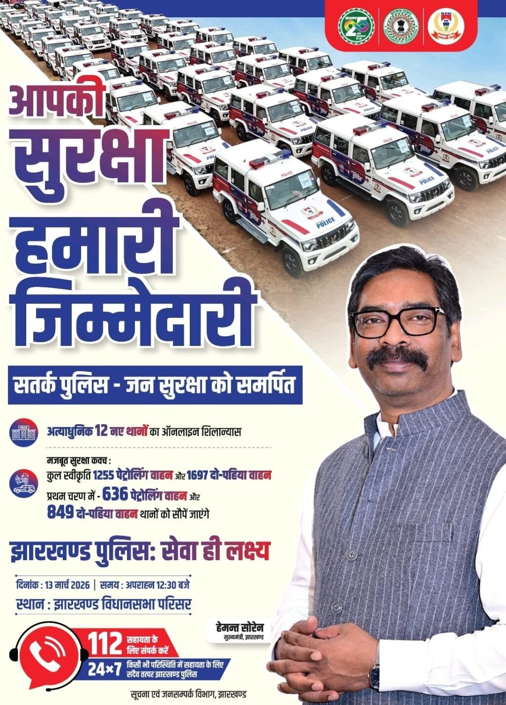 *आपकी सुरक्षा हमारी जिम्मेदारी*सतर्क पुलिस – जन सुरक्षा को समर्पितअत्याधुनिक 12 नए थानों का ऑनलाइन शिलान्यास*मजबूत सुरक्षा कवच :*कुल स्वीकृति 1255 पेट्रोलिंग वाहन और 1697 दो पहिया वाहन प्रथम चरण में – 636 पेट्रोलिंग वाहन और 849 दो-पहिया वाहन थानों को सौपें जाएंगे*झारखण्ड पुलिसः सेवा ही लक्ष्य*दिनांक : 13 मार्च 2026 | समय : अपराह्न 12:30 बजेस्थान : झारखण्ड विधानसभा परिसर*112: सहायता के लिए संपर्क करें**झारखण्ड पुलिस 24×7 किसी भी परिस्थिति में सहायता के लिए सदैव तत्पर*